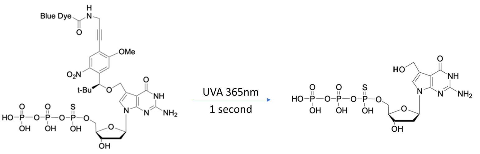 The terminatoing moity (S)-α-tert-butyl-5-OMe-2-nitrobenzyl can be photochemically removed remarkably fast. Upon exposure to UVA 365 nm, LTs will be converted to naturally existing hypermodified nucleosides. The cleaved terminating moity along with the linked fluorescent molecule will diffuse away from the growing DNA strand upon cleavage, allowing for the next incorporation in sequencing by synthesis.