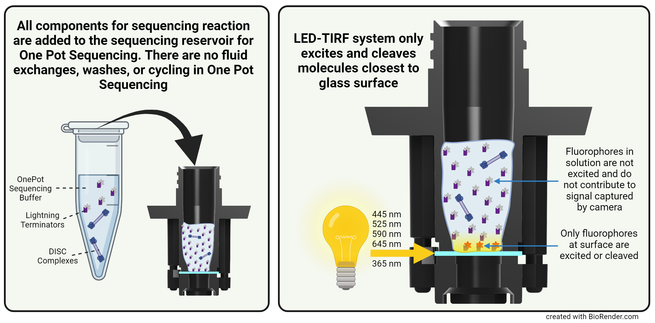 The solution contains sequencing primer, DNA polymerase, Lightning Terminator™, DISCS, and all other essential components for incorporation, LED-TIRF imaging, and LED-TIRF UV cleavage. This single solution is introduced into the reservoir, and with one click of a button the One Pot sequencing run takes off.