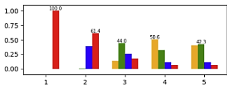 At cycle one of sequencing, we expect clusters to have high amounts of one Lightning Terminator. At cycles greater than one, however, clusters will have lower purity as dephasing accumulates. Here’s an example of Color Transformation results for one cluster across 5 cycles: