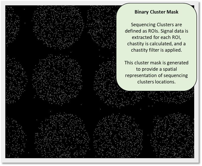 The Pre-Processed Images are used as input for step two of the analysis pipeline: ROI Detection, Intensity Extraction, and Auto-Dictionary. This step of the pipeline includes defining all of the sequencing clusters in the images (referred to as “ROIs”- Regions of Interest); extracting the intensity values from each sequencing cluster (ROI) across all 4 channels in all 16 cycles of sequencing; and defining the color composition for A, C, G, and T (referred to as the dictionary) using signal across all 4 channels for a representative A, C, G, and T cluster.