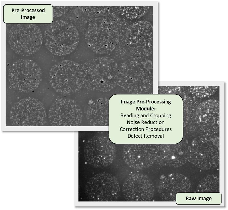 The first step is the Image Pre-Processing Module. The raw sequencing images are fed through this module, and the output is a folder containing all of the pre-processed and registered images. Pre-processing cleans up the raw images up to ensure sequencing clusters can be identified at each cycle and any interfering surface imperfections or debris are excluded from analysis.