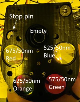 Attach the filter wheel hub to the filter wheel with three hex drive flat head screws (93395A198) and insert a set screw to lock the filter wheel once ready to assemble (91390A092). Insert the filters into the wheel in the order shown below and set the complete filter wheel assembly aside.