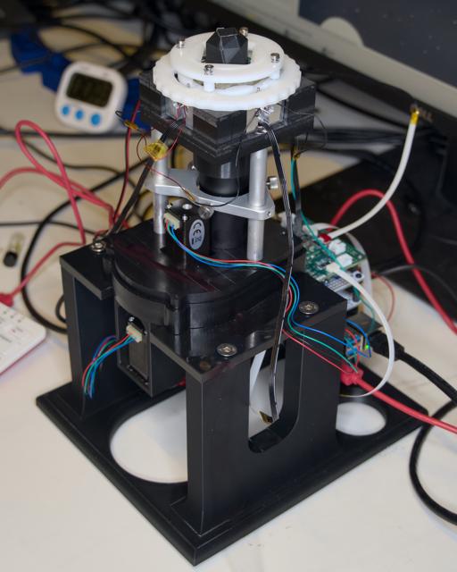 Start by attaching the Positioning Table (60935K71) with two M1.6 socket head screws (91292A264) and thin hex nuts (90710A145) to the camera mount. Then attach the focus motor mount to the other side of the positioning table with 4 zinc plated flat head screws (91263A862). Then mount the stepper motor (STEPPERONLINE Micro Step Motor Nema 8 Bipolar Stepper Motor 0.6A 5.7oz.in/4Ncm DIY Robot, stepperonline.com) with 4 flat head screws (92125A052). Attach the small pulley to the motor and the large pulley to the adjustment knob and tighten the pulley with one M2 socket head screw (91292A833).