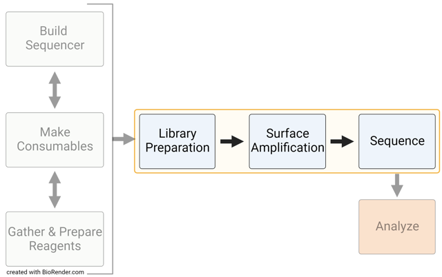 Begin by navigating through the Build and Make Consumables documentation. Here you will find CAD and parts lists to build your Transformer, materials and reagents to make sequencing reaction buffer, protocols for preparing sequencing substrates, and much more. Once the hardware, electronics, and instrument software are complete, you can begin testing your system by simply imaging a prepared sequencing reservoir.