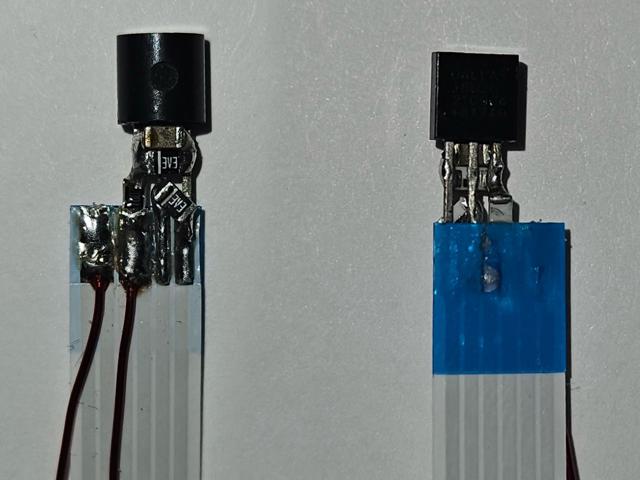 In the past, we have used a 1-wire sensor to measure the temperature. While this made it easy to implement software to read the output, it required some point-to-point microsoldering to power the sensor. This part would have to be remade if the heatsink that the sensor was mounted to needed to be replaced for any reason.