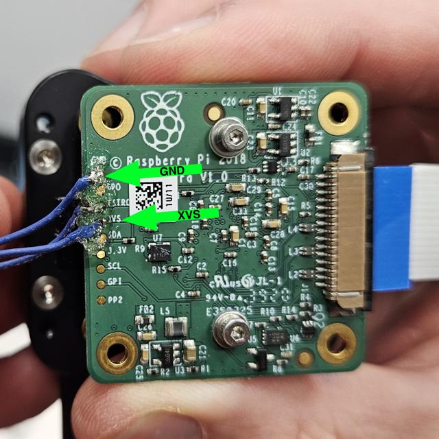 As pictured, the camera’s XVS and GND go to LV3 and a common GND. HV goes to one of the 3.3v pins on the Pi and HV3 goes to GPIO pin 3.
