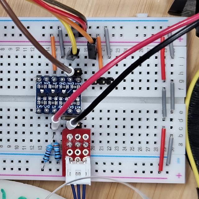 XVS is at a 1.8v logic level, and the Pi’s GPIO pins are at a 3.3v logic level. While the base board has a level shifter built in, it is in the wrong direction. Instead, we use an off-the-shelf level shifter, like this one from SparkFun along with some resistors to create a voltage divider for the 1.8v reference voltage on the LV pin.