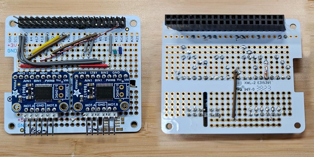 We use stepper motors to rotate the filter wheel and adjust focus. To enable precise control, we opted to connect two sets of dual-channel H-bridges (Adafruit TB6612 breakout board for prototyping) directly to the Pi GPIOs. To make these connections cleaner, we mounted the H-bridges to a prototyping HAT.