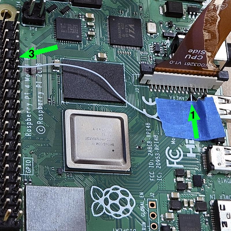 - Solder a AWG 30 wire from pin 5 on the camera connector to GPIO pin 6, making sure that a HAT can still be inserted on top of the Pi.